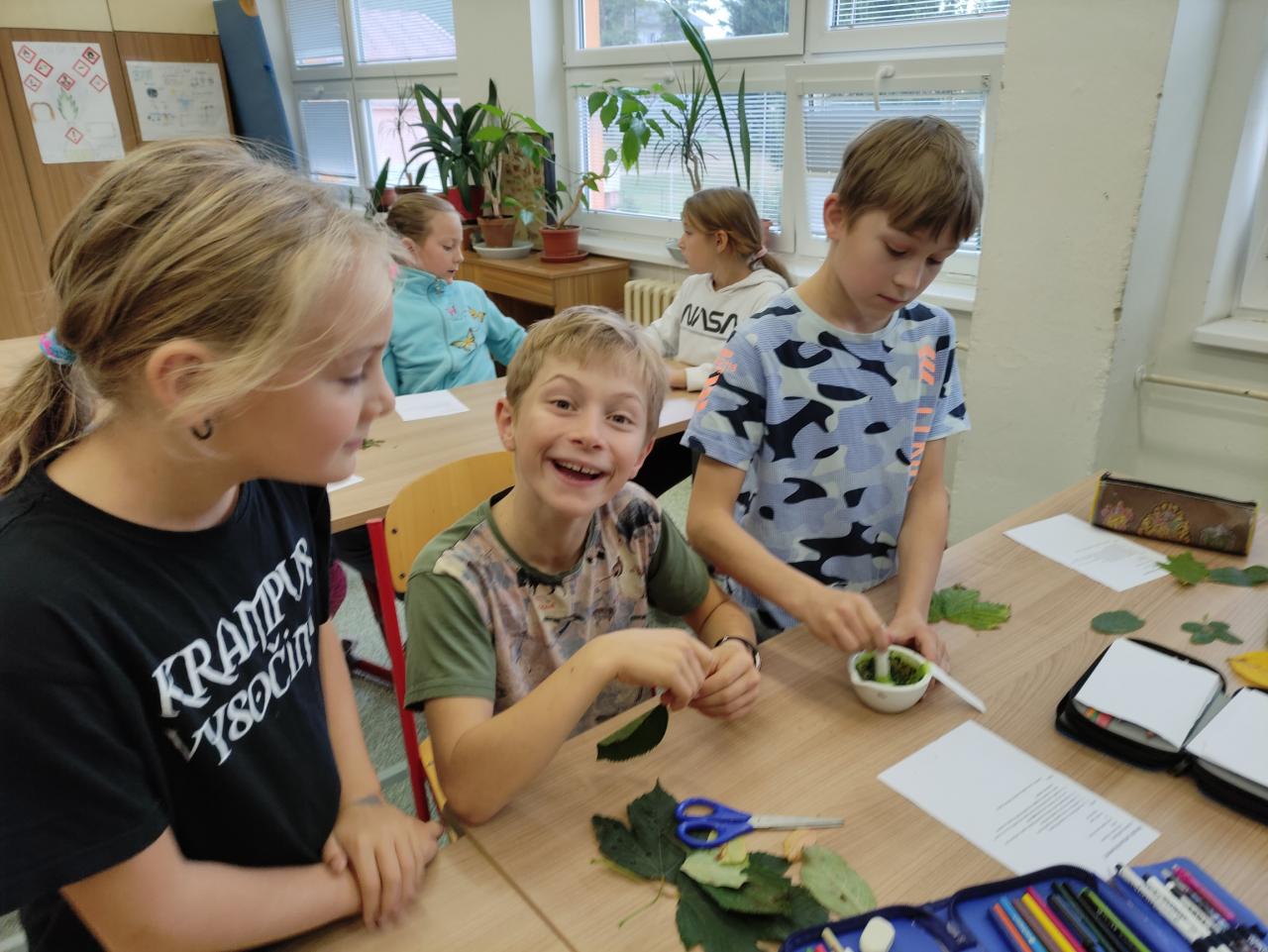 Žáci čtvrtých tříd si zkusili ověřit, proč se na podzim barví listy stromů. Vyzkoušeli si chromatografii, při které oddělili jednotlivá listová barviva.